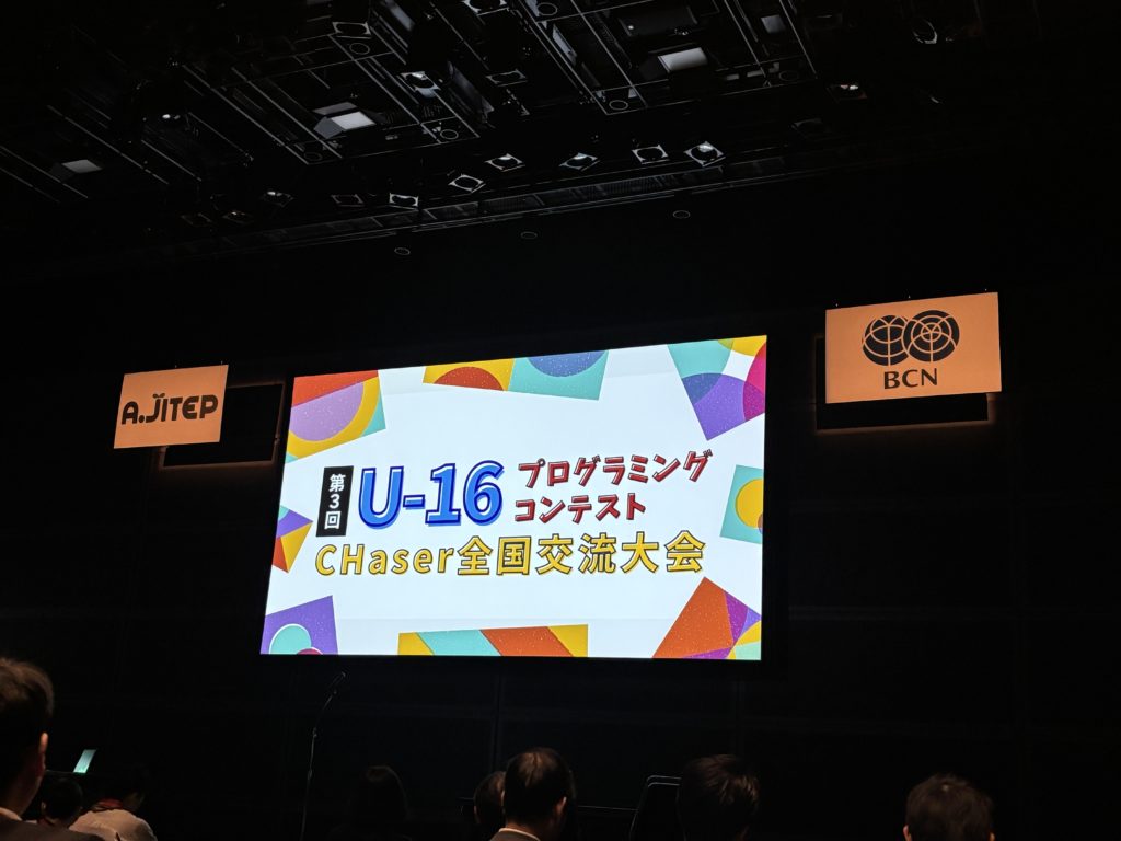 式の前半では、プログラミング競技「CHaser」による全国交流大会が実施され、各地の大会を勝ち抜いた優勝者たちが集い、全国一位を決めるトーナメント戦が繰り広げられました。