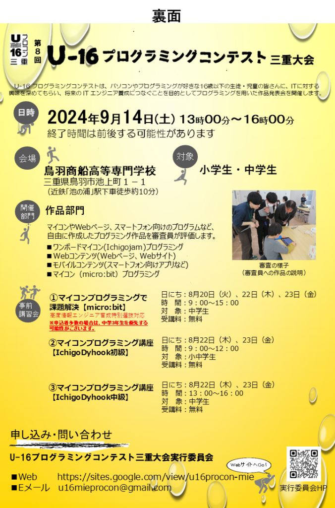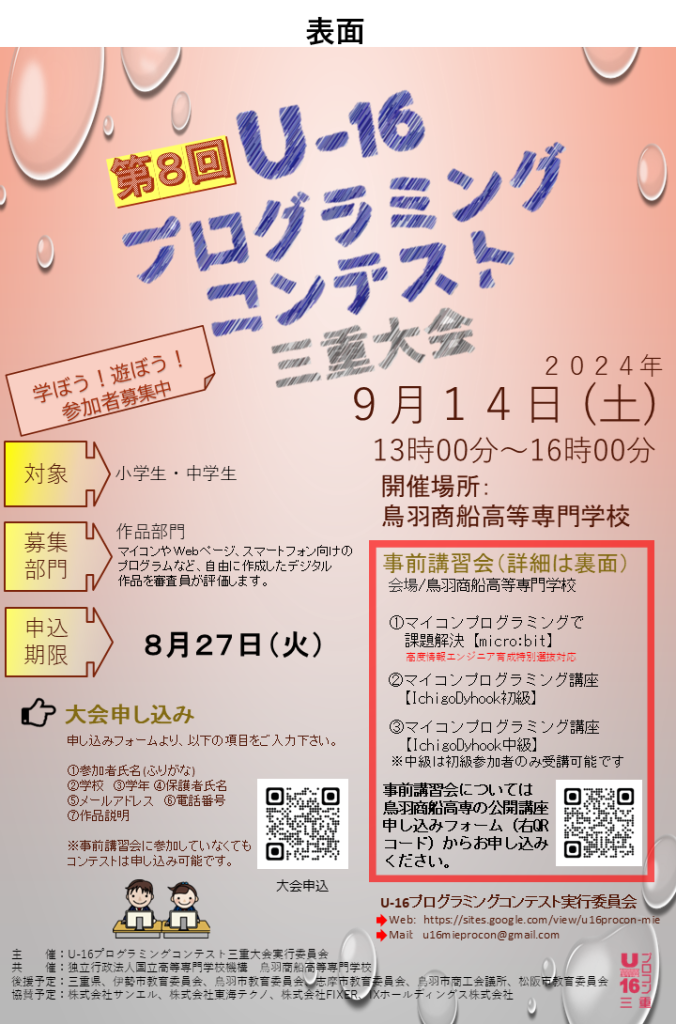 ・事前講習会「マイコンプログラミングで課題解決【micro:bit】」の参加者、U16プロコン出場者につきまして、質問、疑問点など対応いたします。以下のメールアドレスまで、ご連絡ください。