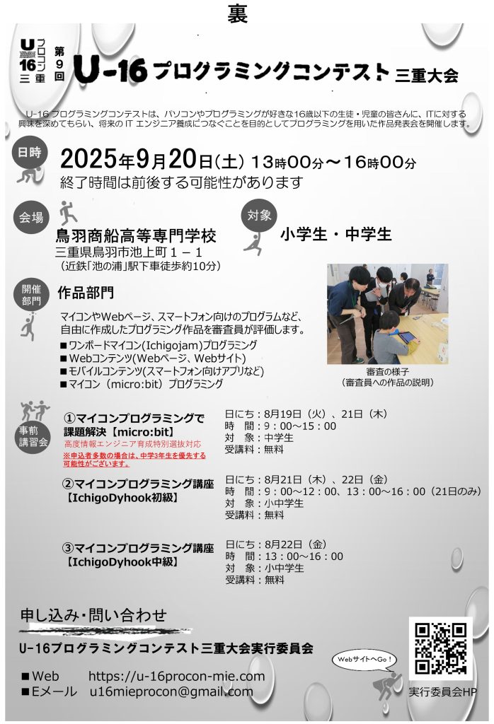 ・事前講習会「マイコンプログラミングで課題解決【micro:bit】」の参加者、U16プロコン出場者につきまして、質問、疑問点など対応いたします。以下のメールアドレスまで、ご連絡ください。