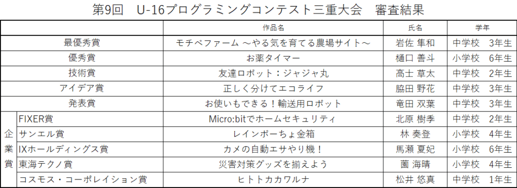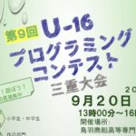9月20日(土)鳥羽商船高等専門学校で開催された、第9回U-16プログラミングコンテスト三重大会の結果は以下の通りです。